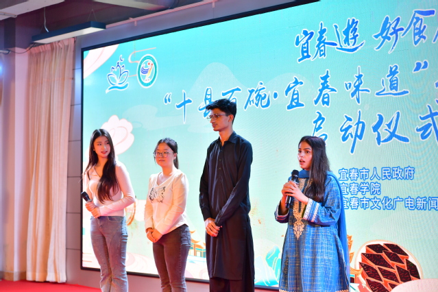 开幕式上,一首悠扬悦耳的《月亮知道我想你》,使听众们仿佛置身于美丽的梦境。活动现场邀请学校的2名中国学生和2名留学生上台分享自己最喜欢的宜春味道,学子互动环节趣味十足,赢得台下热烈掌声,现场氛围热闹非凡。