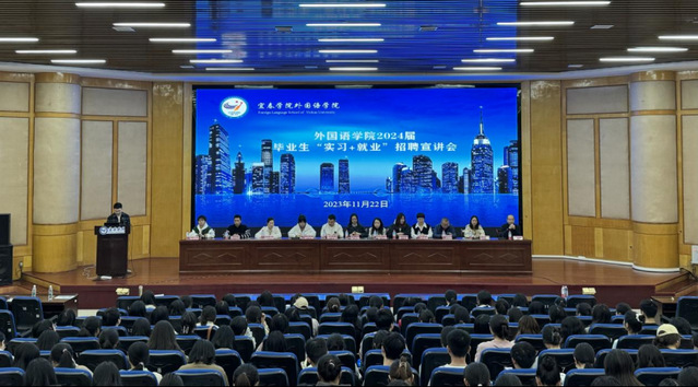 本站讯(学生通讯员 余梦洁)为进一步推进毕业生就业工作,为广大毕业生搭建就业平台,拓宽就业渠道,11月22日下午,外国语学院在教学楼主楼学术报告厅举办2024届毕业生“实习+就业”招聘宣讲会。本次招聘宣讲会邀请到了福海供应链(深圳)有限公司、深圳市华企网络科技有限公司、永康市久久太阳电子商务有限公司等12家用人单位参加。外国语学院党委书记伍忠,该院毕业班班主任(辅导员)及2020级、2021级在校学生参加。