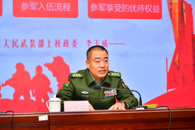 随后,李玉成以《携笔从戎 绽放青春建功军营》为题,就参军意义,参军入伍条件,参军入伍基本流程,参军享有的优待权益等四个方面进行了全面讲解,鼓励大学生们积极响应国家号召,踊跃报名参军,到军营实现人生梦想。