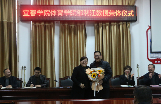 本站讯(学生记者 颜佳羽 林明雄)三十多年,弹指一挥间,从风华正茂到鬓角飞霜。纷繁的是岁月,纯粹的是为教育事业拼搏奉献的崇高境界。为了弘扬尊师重教、敬业爱岗的良好风尚,增强教师们的归属感、荣誉感和幸福感,肯定退休教师多年来为教育事业发展作出的贡献,激励青年教师们继续发扬优良传统,3月13日,体育学院在会议室为退休教师邹利江教授举行了一场庄重而温馨的荣休仪式,为荣休教师送上最真挚的祝福、表达最崇高的敬意。校党委委员、副校长余新卫与校人事处、离退休人员工作处等职能部门领导、体育学院领导班子成员以及教师代表、学生代表参加了荣休仪式。仪式由体育学院党委书记谢军主持。