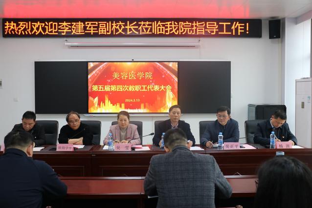 本站讯(美容医学院 供稿)3月13日下午,美容医学院在beat365官网新校区(厚德校区)院工会活动室召开第五届第四次教职工暨工会会员代表大会,校党委委员副校长李建军在离退休人员工作处赵勇科长的陪同下出席大会并致辞。学院党政领导、全体教职工参加会议,会议由副院长杨洲主持。