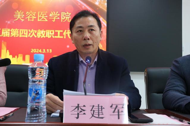 首先,校党委委员、副校长李建军对此次大会的召开表示热烈的祝贺,向一年来对学校教育事业发展和服务学生成长成才做出贡献的全体教职工致以问候和敬意。接下来,他在致辞中充分肯定了美容医学院2023年的主要工作和取得的成绩,对于美容医学院的发展,李建军提出了三点要求。第一,强学习、重应用;第二,把方向、提质量;第三,重实践、抓落实。同时指出通过纵向和横向找差距,系统谋划,思索发展方向。注重创新,协同推进,大抓落实,统筹高质量发展。培养更多的、合格的、实用的美医人才,为地方经济、社会经济的发展做出更大的贡献。