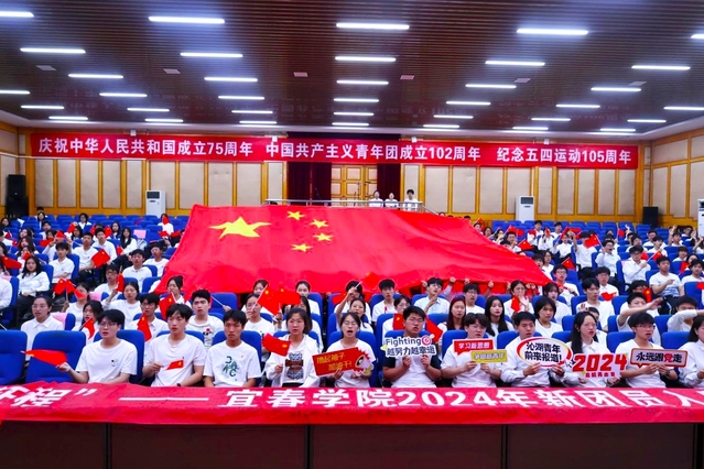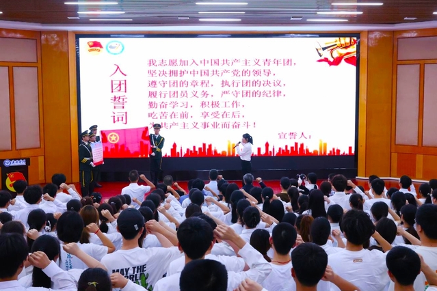 “我和我的祖国,一刻也不能分割,无论我走到哪里,都流出一首赞歌......”仪式上,伴随着嘹亮的歌声,一面巨幅国旗被团员青年们高高举起,团员青年们以自己的方式庆祝中华人民共和国成立75周年。与此同时,排列在巨幅国旗周围的同学们一起挥舞手中的“手持国旗”,与巨幅国旗交相辉映,场面十分壮观。来自生命科学与资源环境学院的徐舒平同学和来自音乐舞蹈学院的祝子钧同学分别作为新老团员代表讲话,纷纷表示将牢记入团誓词,坚定理想信念,练就过硬本领,尽心尽力为学校、为社会做贡献。