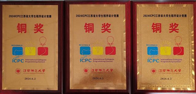 本站讯(数计学院 供稿)近日,2024年(ICPC)江西省大学生程序设计竞赛于江西师范大学计算机信息工程学院先骕楼成功举办。数学与计算机科学学院(软件服务外包学院)共派出5支队伍参赛,经过激烈角逐,3支队伍脱颖而出,斩获奖项。其中,由尧文群、江明、陈厚文三位同学组成的团队(雷丽兰、李颖老师指导),彭曦、刘玲、周易民三位同学组成的团队(何渊仁、黄伟凡老师指导),吴淇、何江涛、刘泳斌三位同学组成的团队(李颖、雷丽兰老师指导)均获ICPC铜奖。