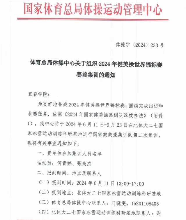 本站讯(学生记者 刘仟思)6月5日,beat365官方网站收到关于《体育总局体操中心关于组织2024年健美操世界锦标赛赛前集训的通知》,beat365官网体育学院舞蹈表演专业2020级学生何青婷、2022级学生张高杰入选国家健美操集训队,并将备战参加2024年健美操世界锦标赛。