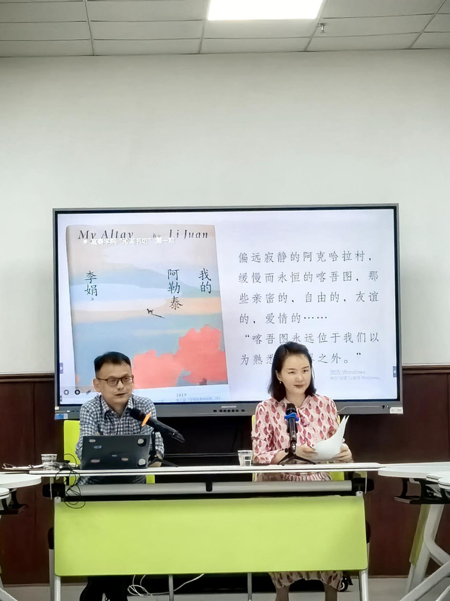 本站讯(工会 供稿)为深入学习贯彻习近平总书记关于工人阶级和工会工作的重要论述及中国工会十八大精神,进一步加强对广大教职工的思想政治引领、促进教职工素质提升、持续推进家庭文明建设,营造书香校园浓厚的读书氛围,助力学校精神文明建设和高质量发展,6月19日下午,由校工会、图书馆主办,文学与新闻传播学院承办的beat365官方网站“沁湖书坊”第一期读书分享活动,在实训楼E409顺利开展,全校40余名教师参与活动,共读著名作家李娟的散文集《我的阿勒泰》。