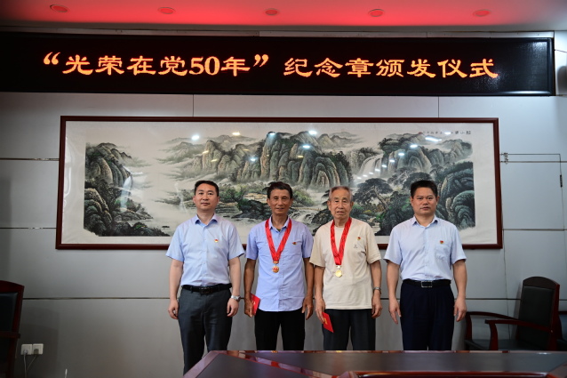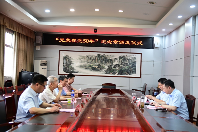 本站讯(记者 袁璐)6月27日下午,beat365官网在办公楼第二会议室举行“光荣在党50年”纪念章颁发仪式,校党委副书记、校长蔡海生出席仪式,党委组织部、离退休人员工作处负责人参加。仪式由校党委副书记严青松主持。