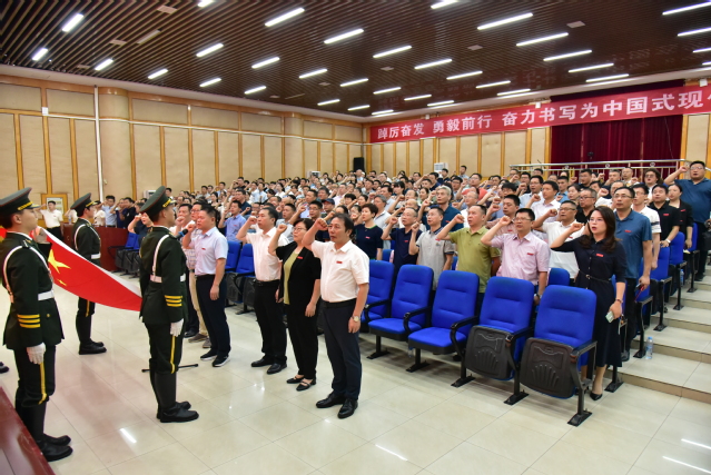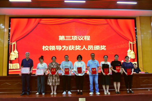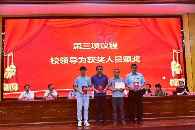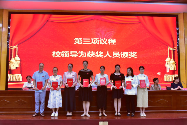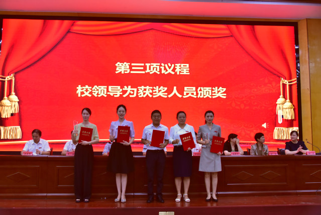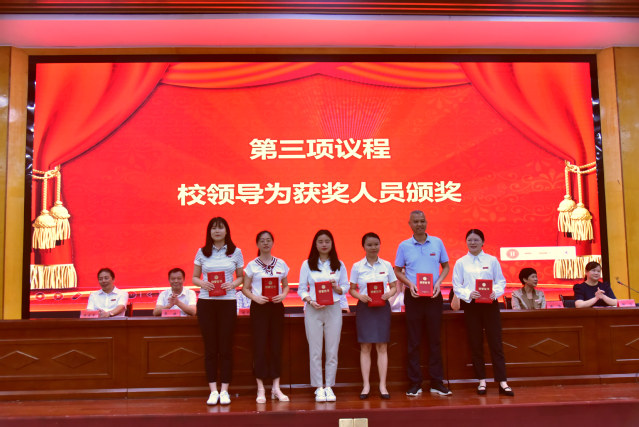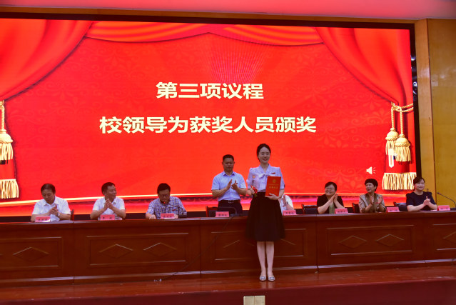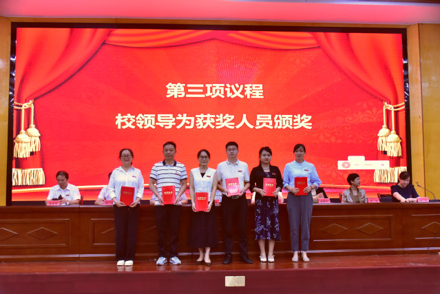 庆祝大会在庄严的国歌声中拉开帷幕。副校长梅光泉宣读了表彰决定;校领导为受表彰的先进个人颁发荣誉证书;与会全体教师在会场面对国旗宣誓。