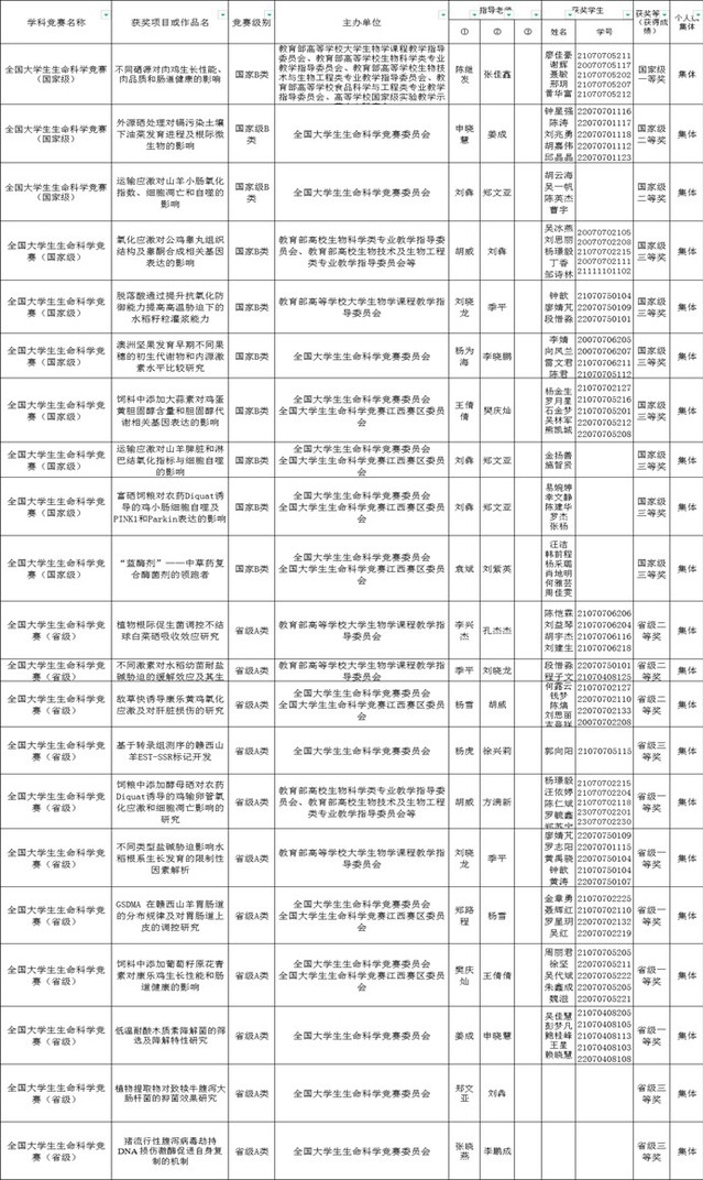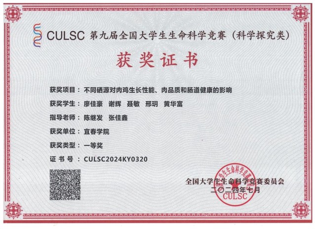 生命科学与资源环境学院廖佳豪、谢辉、聂敏、邢玥、黄华富5位同学在陈继发、张佳鑫老师的指导下完成的“不同硒源对肉鸡生长性能、肉品质和肠道健康的影响”项目荣获全国一等奖。该项目的研究内容和实验设计得到了评审专家的高度评价,充分展现了生命科学与资源环境学院学子的科研潜力和团队合作精神。