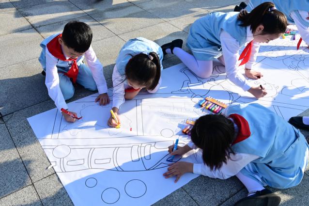 随后,大家共同为10米《共绘中国梦》画卷填色,长长的画卷一字铺开,如同春天的故事在希望的田野上铺展,每个人都专注而认真地描画,用画笔勾勒红色印记,以色彩描绘寄情言志,表达出对党和祖国的深情厚意。