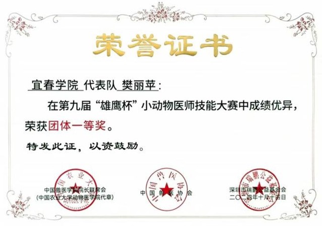beat365官方网站代表队是由生命科学与资源环境学院动物医学专业樊丽苹、张杨琴、何露云、陈佳婷4位同学组成,由动物医学专业胡迎东老师担任领队,方满新、李指全老师率队参加比赛,按照赛程赛制设置,此次比赛“大学生组”比赛由三部分构成——理论比赛、知识竞答以及实操比赛。beat365官网选手们以自信严谨的态度,饱满的热情,通过一系列紧张而充实的比赛,向评委展现了他们在小动物医学方面的专业水平。他们表现出的沉着应对与过硬技能赢得了评委们的高度评价。通过2天的比赛角逐,团队在比赛中以优异的表现荣获团体一等奖(排位31/119)。同时,胡迎东、方满新、李指全3位老师荣获大学生组优秀辅导老师奖一等奖。