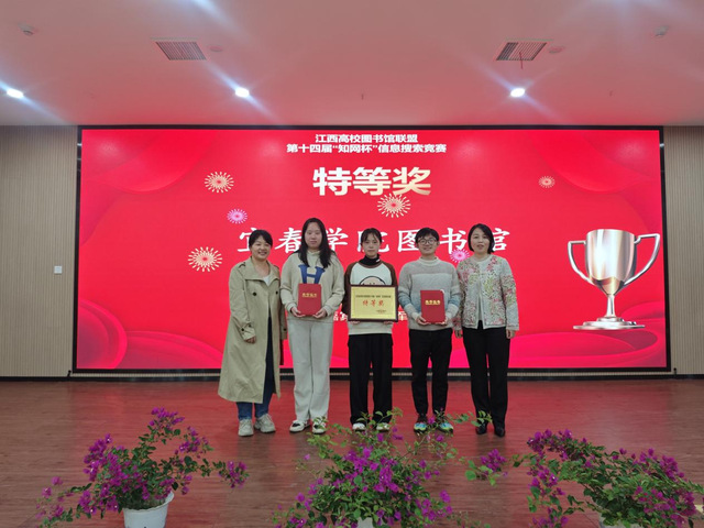 本站讯(图书馆 供稿)10月29日,江西高校图书馆联盟第十四届“知网杯”信息搜索竞赛决赛在江西农业大学举行。经过长达一个月的初赛、校内选拔赛和联盟决赛的激烈角逐,beat365官网化生学院研究生余浩、医学院吴子彦、汪雨萌三位同学最终在比赛中脱颖而出,总分排名第一,荣获特等奖,取得了beat365官方网站在此项赛事中有史以来的最好成绩。图书馆获团体特等奖,葛琳琳老师获“优秀指导老师”称号。