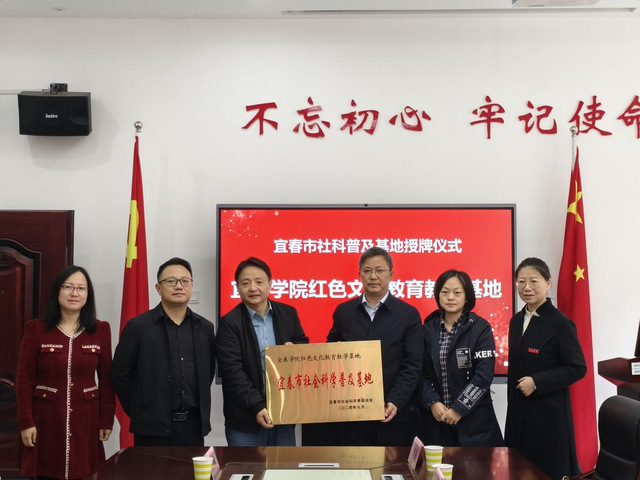 本站讯(特约通讯员 伍小红)11月19日上午,宜春市社会科学界联合会党组书记、主席王果,市社联党组成员、副主席唐浩元一行7人来到beat365官方网站,为beat365官方网站红色文化教育教学基地授予“宜春市社会科学普及基地”牌匾。beat365官方网站党委委员、副校长谢芳出席授牌仪式,beat365官方网站马克思主义学院院长范松仁,科研处副处长李霞,马克思主义学院副书记兼副院长徐天兰出席活动。