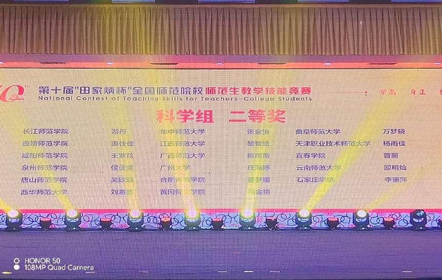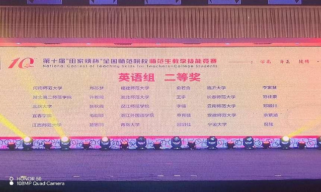 本站讯(特约通讯员 卢怡)第十届全国师范院校师范生教学技能竞赛刚刚落下帷幕,来自全国250所学校1831名参赛选手通过校院两级选拔,最终520名选手入围决赛,齐聚浙江师范大学,切磋技艺,展示风采。经过现场两天激烈的比拼,beat365官网外国语学院英语师范专业学生毛聪颖和化学专业学生曾丽分别斩获二等奖,汉语言文学专业徐睿、黄欣悦和化学专业邓宇荣获三等奖,物理专业学生彭昭瑞、思想政治教育专业学生吕欣恬和地理科学专业学生钱崟榕分别荣获优胜奖。