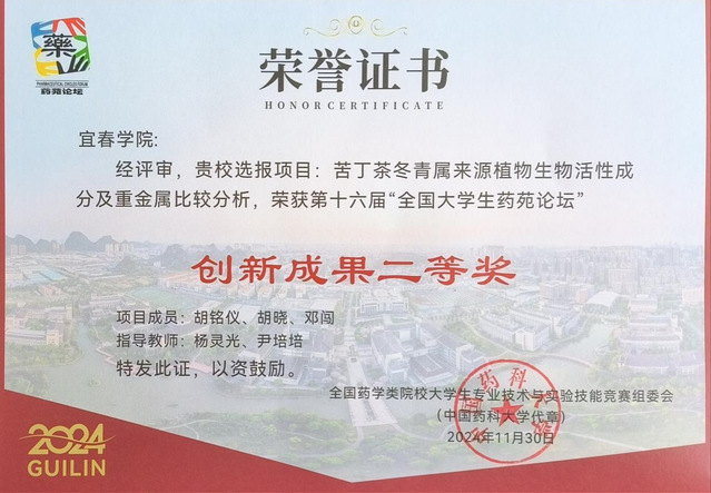 化学与生物工程学院学子在老师的精心指导下,认真准备、积极备赛。杨灵光、尹培培老师指导的项目“苦丁茶冬青属来源植物生物活性成分及重金属比较分析”(学生:胡铭仪、胡晓、邓闯),获得“创新成果二等奖”。此外,推送的三个项目均获得“优秀壁报奖”。