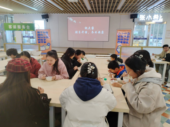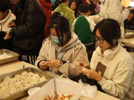 不到半小时,六七百个饺子完成了。食堂工作人员将饺子煮熟,一盘盘端上来分给师生们品尝。同学们吃着自己亲手制作的热腾腾的饺子,赞不绝口。来自江西吉安的肖恒馨同学说:“在这一年中最长的黑夜来临前,吃上了最美味的饺子,再也不怕冻耳朵了!”