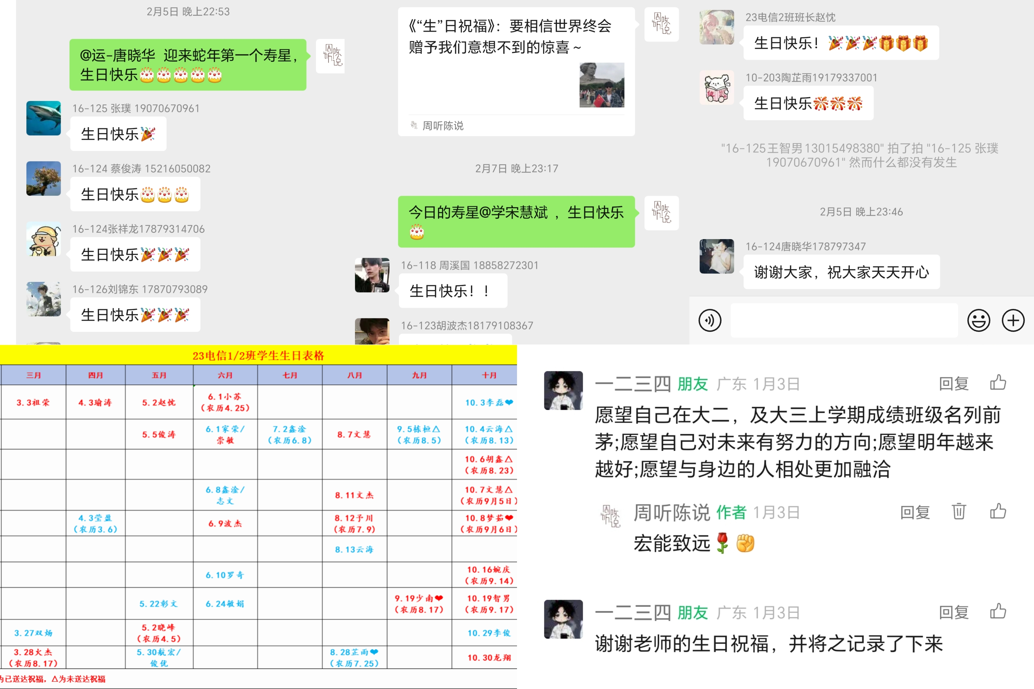 陈浩老师自2023年9月担任23级电子信息专业辅导员以来,便着手建立“一人一档”成长档案,通过班级调研、谈心谈话、家校联动等方式,累计收集学生兴趣爱好、成长经历等个性化信息300余条。在此基础上,他创新打造“生日祝福+成长档案+家校共育”三维育人模式,将每位学生的生日转化为思政教育的“关键节点”。