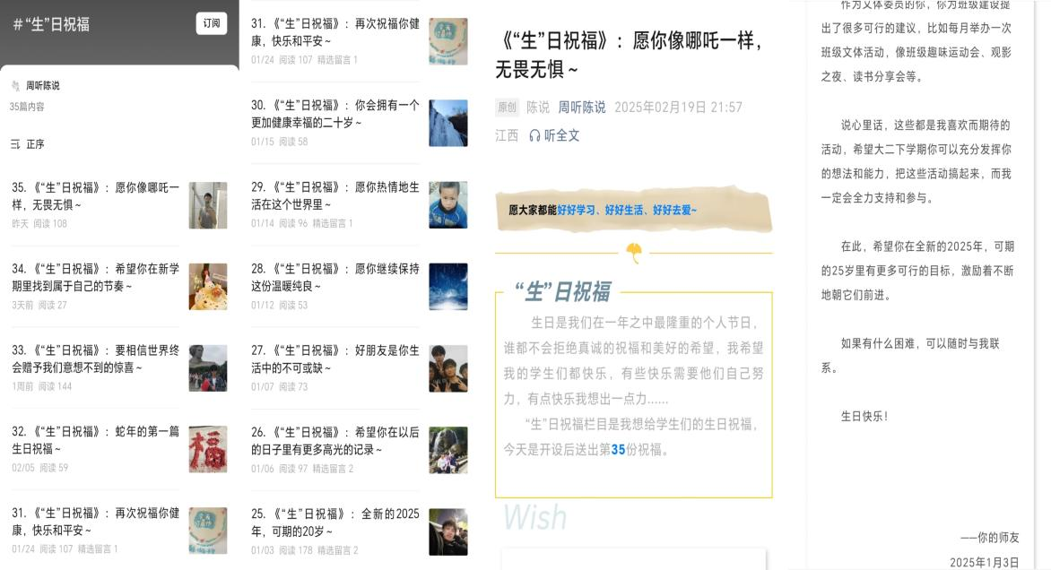 数据显示,在陈浩老师的个人公众号里,已经建立起了该班级62名学生的生日日历系统,累计发布个性化祝福推文36篇,其中寒假期间完成10篇。每篇推文平均包含3个以上个性化元素,涉及理想信念、价值观念、道德情操、心理健康、职业规划等多个维度。