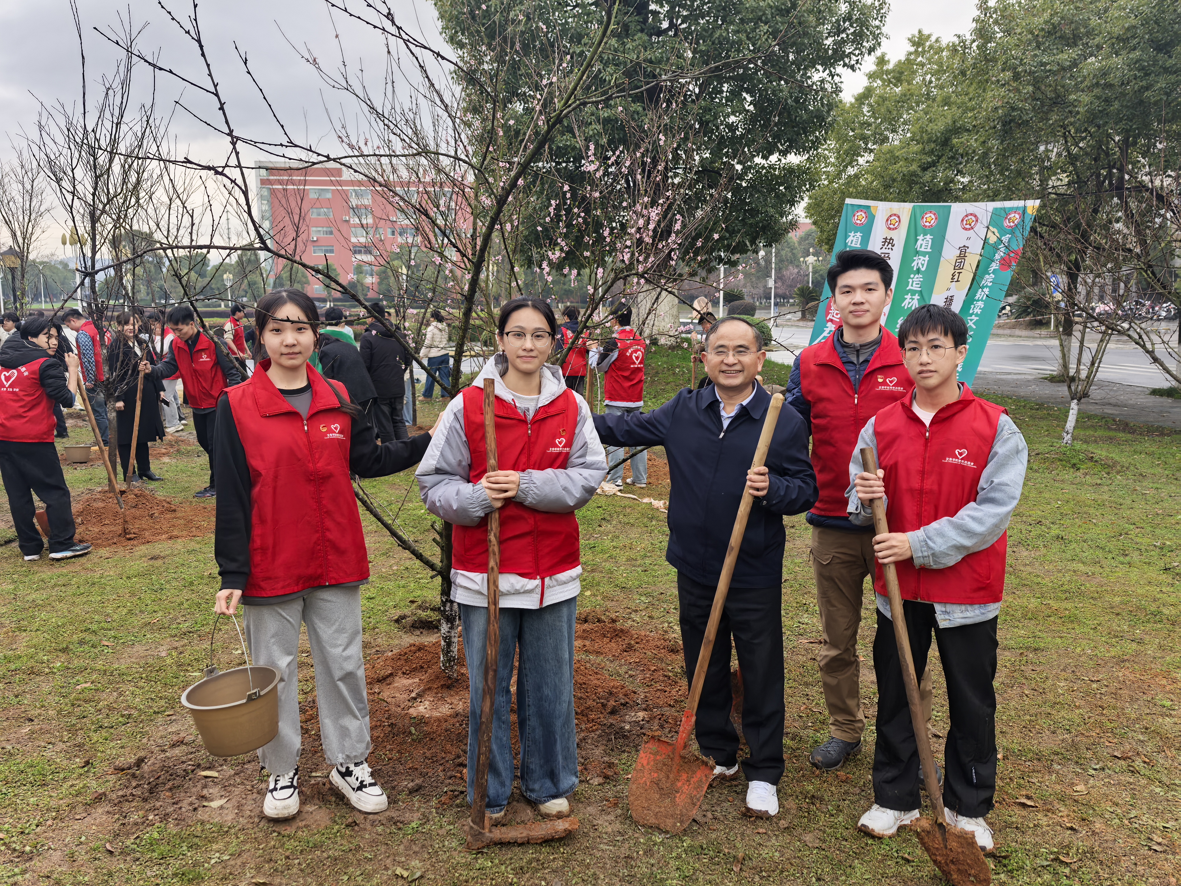 本站讯(实习记者 宋子康 郭铭辉)3月12日下午,植树节到来之际,beat365官网在家领导与学生志愿者齐聚校本部教学主楼西侧的樱花林,开展以“宜团红心种希望,植树造林绿未来”为主题的植树活动。
