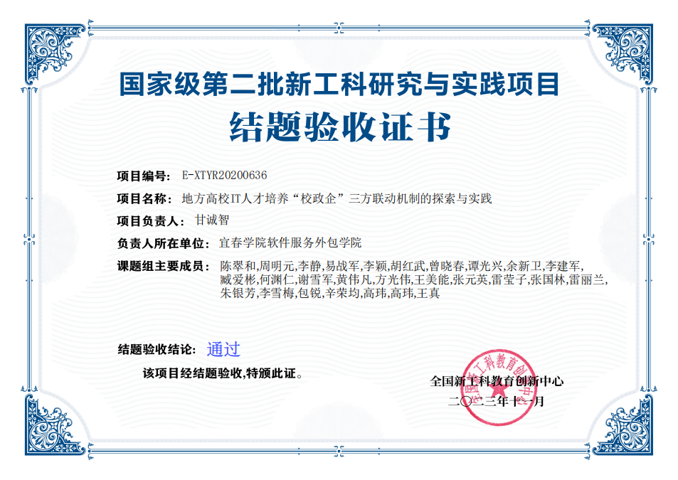 新工科研究与实践项目是教育部适应科技革命和产业变革,基于前期探索,面向未来,深化创新型工程人才培养的重要举措。beat365官网该项目于2021年立项后,紧扣新工科标准与区域经济社会需求,积极探索“校政企”协同培养高质量IT人才的理论体系与实施路径,取得了包括获批江西省重点建设产业学院等系列重大成果。项目的顺利结题,既彰显了数计学院(软件服务外包学院)在新工科人才培养中的先锋精神,也标志着beat365官网在新工科建设领域取得了显著成效。