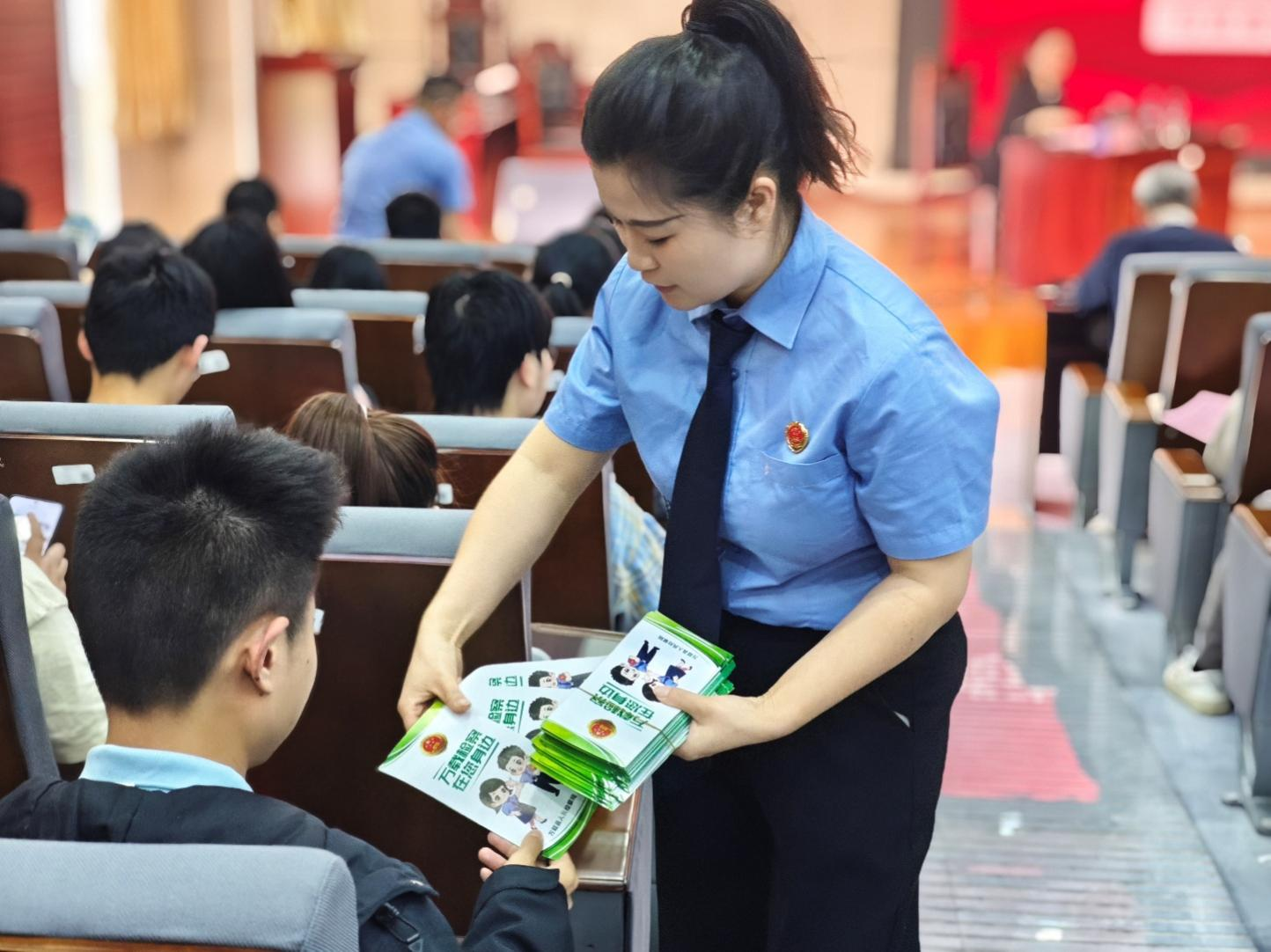 讲座期间,万载县人民检察院向在场学生发放了精心制作的法治宣传资料。这些宣传单内容丰富,涵盖检察机关职能介绍、典型案例解析以及法律职业发展建议等内容,为同学们提供了实用的法律知识参考。
