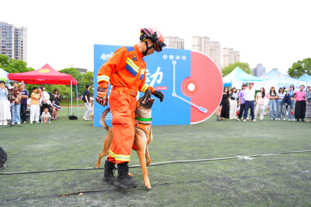 来自宜春市消防救援支队搜救犬分队的指战员还为同学们带来了消防搜救犬训练展示,以及消防员职业体验等活动。
