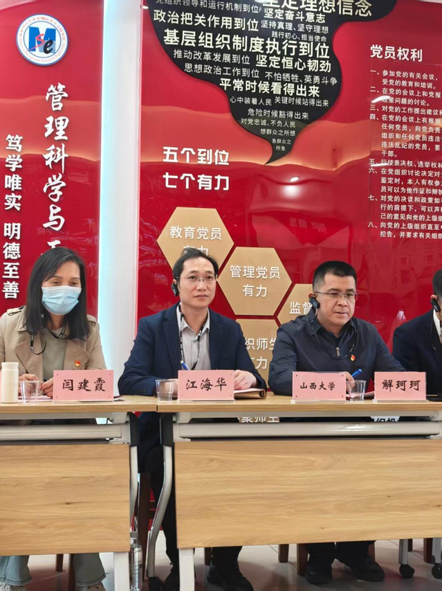 本站讯(政法学院 供稿)为推进新时代党建 “双创” 工作,汲取先进经验,4 月 25 日,政法学院党委书记江海华率 4 人团队,前往山西财经大学开展党建对标学习,山西财经大学管理科学与工程学院党委副书记陈霞,法学院党委副书记高俐弘、团委书记兼本科生党支部书记陈思静及相关师生代表参与交流。