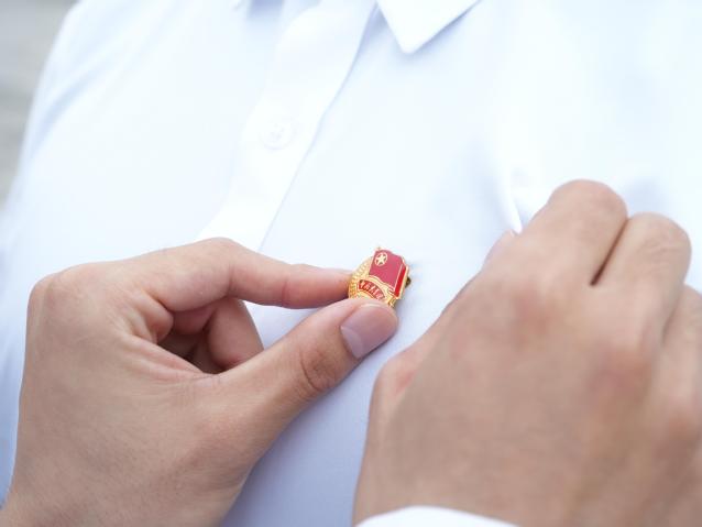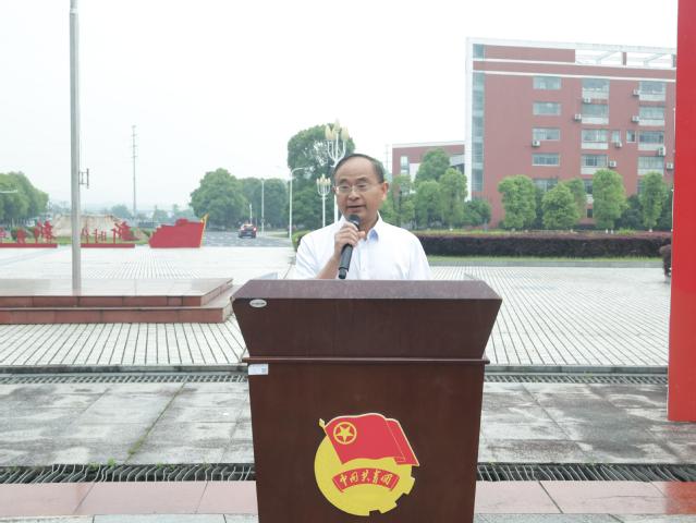 汤林海宣读新团员名单,出席活动的领导、老师为新发展团员颁发团员证、佩戴团徽。