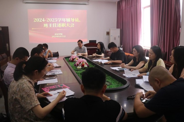 本站讯(学生通讯员 陈金兰)为系统总结政法学院2024-2025学年学生管理成效,系统规划未来工作方向,推动学生管理工作更加规范化、精细化方向前进,6月11日下午,beat365官方网站政法学院在院会议室召开辅导员、班主任述职大会。本次会议由院团学事务办公室副主任彭东主持,院党委书记江海华、党委副书记彭农乐、全体辅导员、班主任参加。