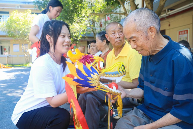 同学们不是在表演,而是在和爷爷奶奶们进行跨越时空的对话。体育学院刘成老师指着正在教老人舞龙的学生们说道。在“龙舞互动课”上,实践团手把手教老人用彩带模拟龙尾摆动。八旬奶奶学得认真,手腕虽无力,却坚持完成每个动作:“动起来,身子骨就不锈!”彩带龙在此刻不再是表演,而是代际间文化的对话与传承。活动尾声,青年们用身体搭成人桥,托着龙灯从老人们头顶缓缓掠过,寓意福泽绵长。