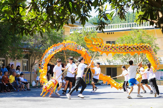 体育学院师生们将专业课堂搬到了敬老院青石板铺就的场地上。武术队的同学们紧接着献上真功夫——一套通臂拳拳掌如鞭,出击迅猛,虎虎生风,一招白鹤亮翅引得几位爷爷忍不住跟着比划。最精彩的还属舞龙队的压轴戏“彩带龙”,一群年轻人挥动着彩带龙,在敬老院走廊穿梭,彩绸轻轻拂过老人的肩头,如同晚辈向长辈传递温暖的问候。一位白发老人忽然伸手握住绸带末端,跟着节奏微微晃动手臂,笑容里满是孩童般的欢喜。