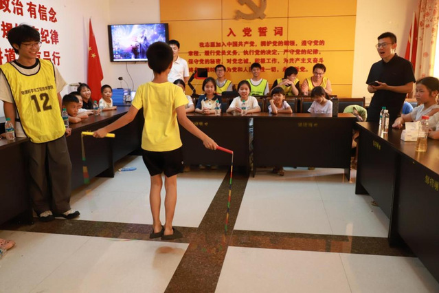 实践队将心理美育与红色教育深度融合。心理健康课堂上,“情绪传递”“团队拼图”等游戏帮助孩子们认识自我、学会合作;针对双胞胎康灵胧、康灵瞳姐妹的个案,志愿者进行“一对一”疏导,让笑容重新绽放。红色文化课堂里,《爱我中华》的嘹亮歌声、《沁园春·雪》的铿锵诗句、《红星耀中国》的活力手势舞,让红色基因在童心中悄然生根。