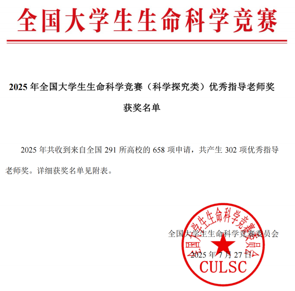 全国大学生生命科学竞赛作为国内生命科学领域最具影响力的学科竞赛之一,始终致力于激发大学生科研热情,锤炼其创新与实践能力。其中,科学探究类赛道更是对参赛师生科研素养与团队协作能力的全面检验。据悉,本届“优秀指导老师奖”评选标准严格,竞争激烈。评选仅面向在近三届(2022-2024年) 竞赛中带领团队获得国家级奖项的教师开放申报。经过严谨的层层筛选,在来自全国291所高校提交的658份有效申请中,最终仅有302项荣誉脱颖而出,获奖率不足46%,充分彰显了该奖项的高含金量与严苛选拔机制。