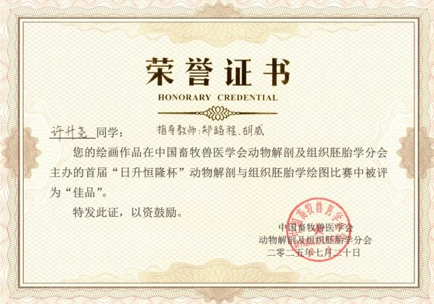 许升尧作品《马全身骨骼手绘图》被评为“佳品”;
