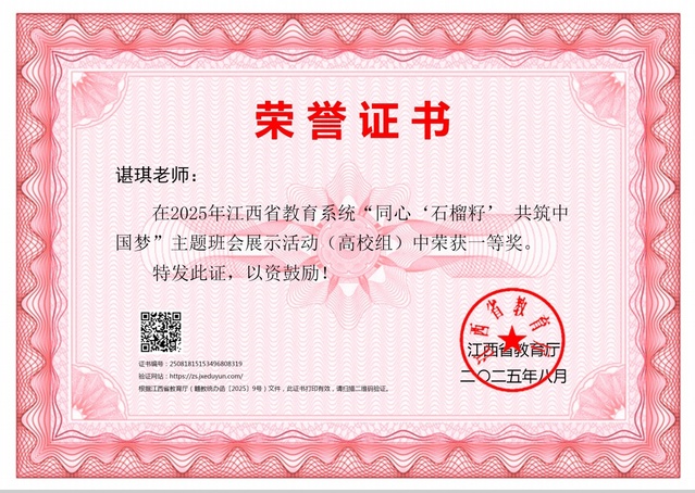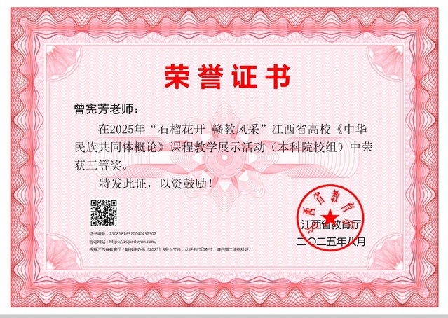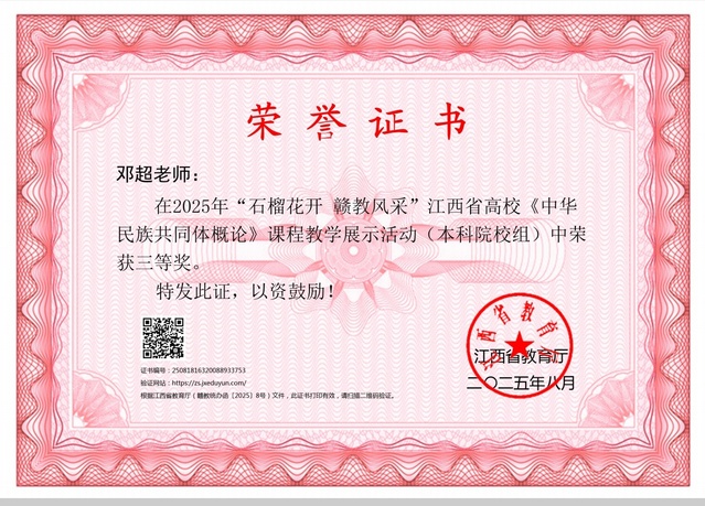 本站讯(党委统战部 供稿)近日,2025年全省铸牢中华民族共同体意识教育展示活动公布评选结果,beat365官网体育学院辅导员谌琪在“同心‘石榴籽’ 共筑中国梦”主题班会展示活动中荣获一等奖,马克思主义学院邓超和曾宪芳在“石榴花开 赣教风采”江西省高校《中华民族共同体概论》课程教学展示活动中都获得三等奖。