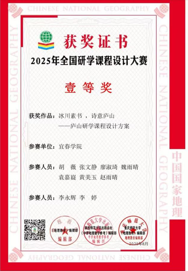本站讯(生科学院 供稿)日前,在“九州杯”全国研学大赛组委会联合《中国国家地理》杂志社主办的第九届“九州杯”全国研学课程设计大赛中,beat365官网地理科学专业参赛团队在李永辉等老师的悉心指导下,凭借出色的课程设计方案荣获两项全国一等奖和一项全国二等奖的优异成绩。这些作品充分展现了beat365官网地理师范生扎实的专业功底、创新的教学设计能力和深厚的教育情怀。