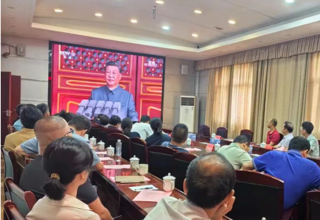 活动第一阶段,全体人员集中收听收看纪念中国人民抗日战争暨世界反法西斯战争胜利80周年阅兵式。