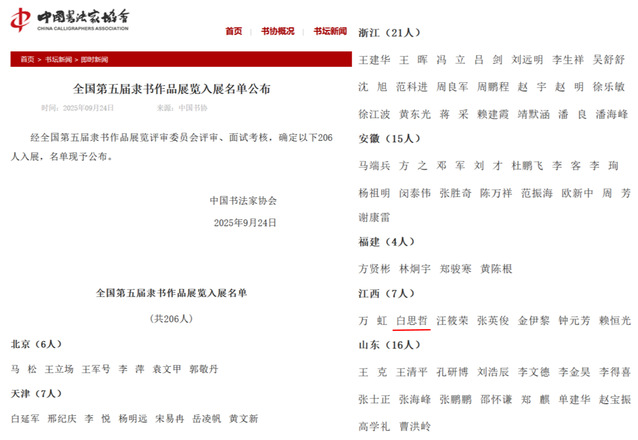 本站讯(美术与书法学院 供稿)9月24日,中国书法家协会正式公布“全国第五届隶书作品展”入展名单。美术与书法学院书法学专业2023级本科生白思哲同学创作的隶书作品,从全国15214件投稿作品中脱颖而出,成功入展。