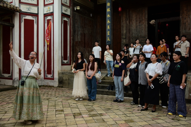 研学的文化篇章在万载古城徐徐展开。作为以万载非物质文化遗产与赣派建筑风情为核心的文化地标,万载古城完整保存着明清至民国时期的珍贵遗存,构成了中国保存较完好、极具赣西文化特色的古建筑群。同学们重点走进郭氏宗祠与绿阴公祠,近距离感受赣派建筑的独特魅力。祠堂内雕梁画栋、木构精巧,精美的木雕遍布梁枋与门窗,既有“家国同构”的传统礼制内涵,又融入了万载本地的工艺特色。大家驻足观察祠堂的建筑格局,聆听讲解员介绍宗祠背后的家族故事与民俗传统,在触摸古建筑肌理的过程中,不仅读懂了赣派建筑的匠心,更深刻理解了其中蕴含的“尊祖敬宗、家国相依”的文化基因,让爱国主义教育在文化寻根中更添厚重感。