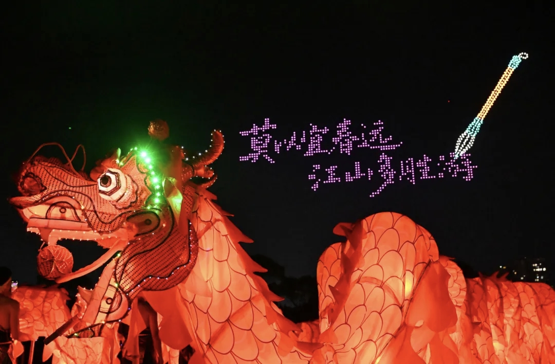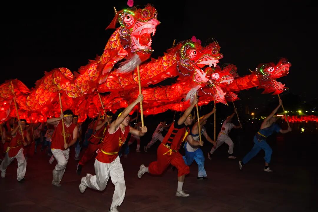 当晚20时,随着一阵激昂的锣鼓声响起,闭幕式核心表演环节正式开启。20条火龙从宜春体育中心浩荡出发,赤色龙身缀满闪烁火光,在夜色中如“活”过来一般,蜿蜒向前、飞腾跳跃,一路朝着市行政中心广场奔去。龙身起伏间,仿佛真有蛟龙欲腾空追月,既承载着市民对美好生活的热切祈愿,也瞬间点燃了节日的热闹氛围。沿途数万市民游客被这壮观景象吸引,自发跟随队伍前行,欢呼声、喝彩声与鼓点声交织在一起,汇成中秋夜最动人的乐章。
