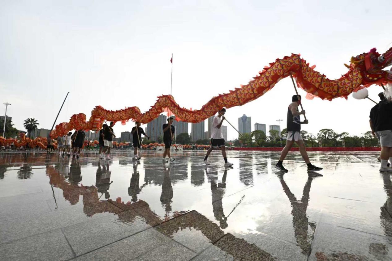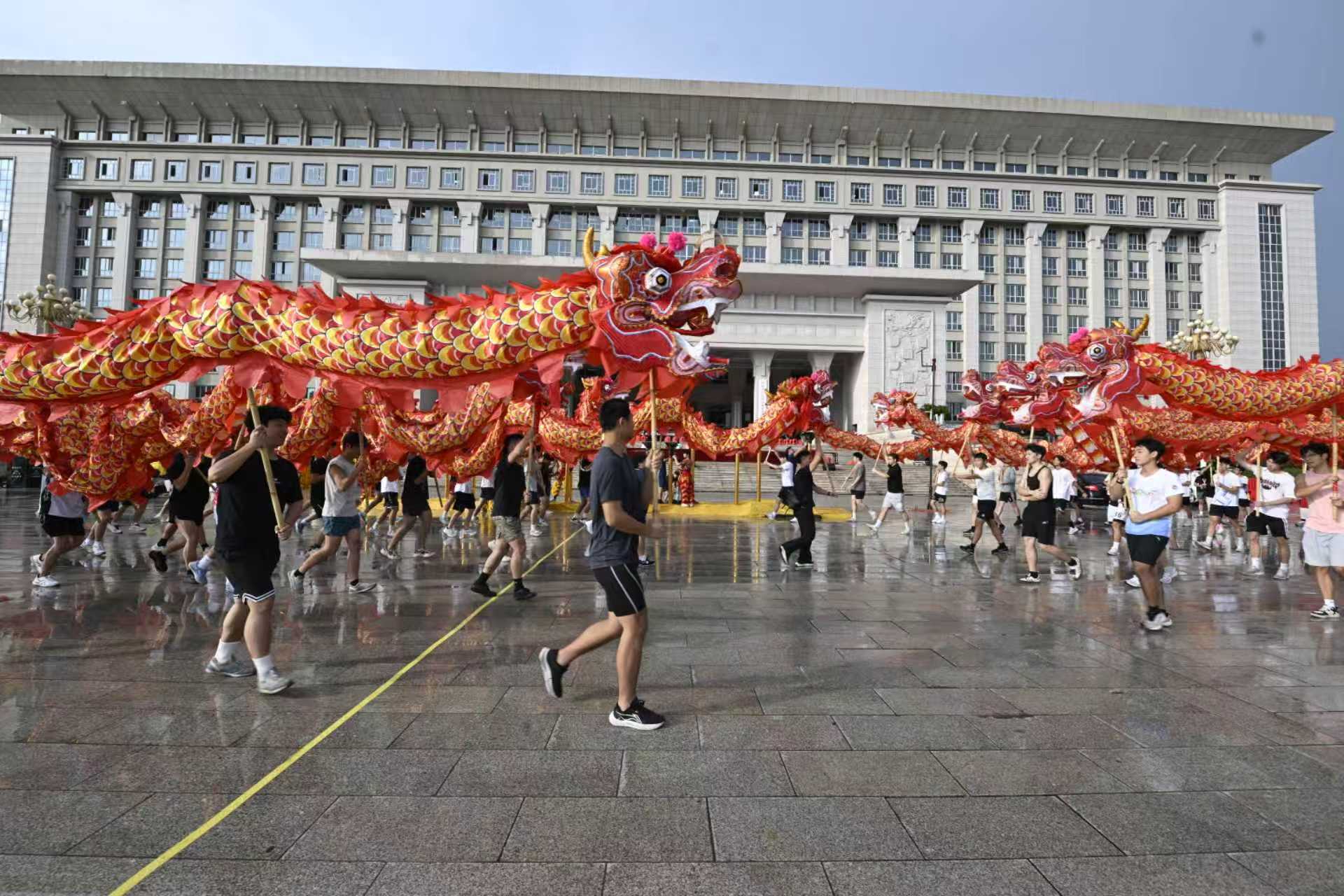 为打造“火龙追月”经典民俗活动,beat365官方网站体育学院近400名师生在9月初便开启了紧锣密鼓的创编与训练工作。从舞龙动作的精准编排、队形变换的创意设计,到鼓点节奏的默契配合,团队成员逐帧打磨细节,开展了数十轮高强度集中训练。9月29日下午16时,天空飘起淅沥秋雨,舞龙队伍与带队教师准时抵达宜春市行政中心广场,开启闭幕式前的最后一次现场彩排。雨水打湿了龙身、模糊了视线,却丝毫未减队员们的热情——在石昊伦老师的统筹指导下,大家踩着鼓点,精准完成场地定点、动作衔接,每一个腾跃、每一次盘旋都力求完美,雨中挺拔的身影尽显体育学子的坚韧与担当。