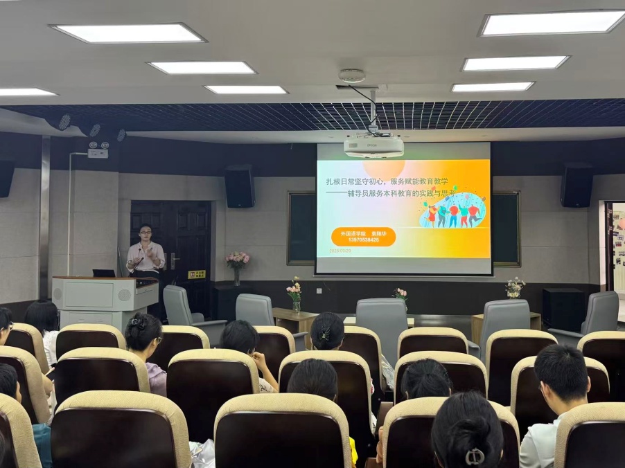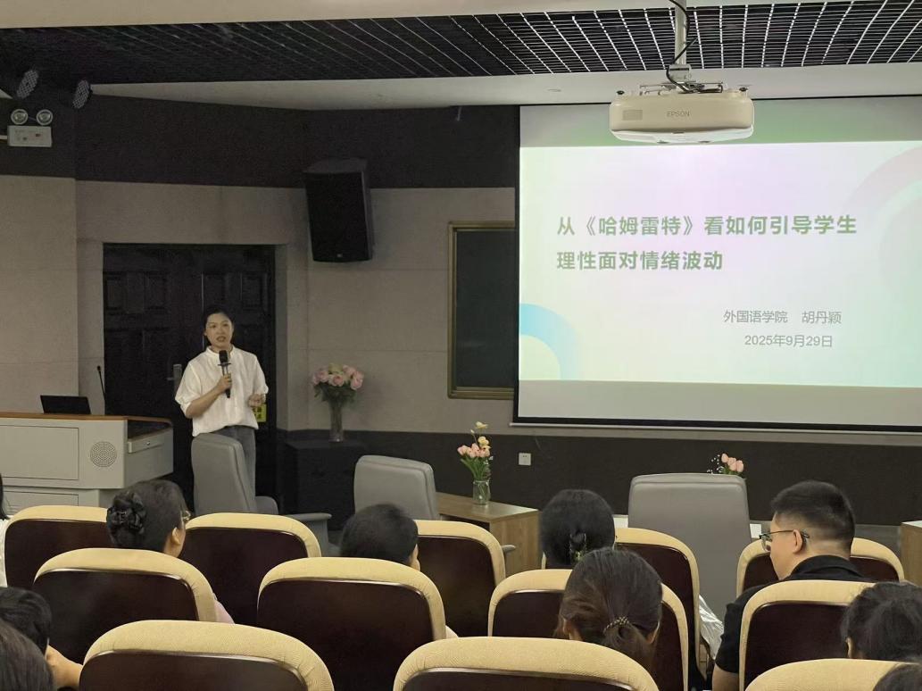 在“心灵放映室”环节,外国语学院胡丹颖老师作了题为《从〈哈姆雷特〉看如何引导学生理性面对情绪波动》的专题分享。胡老师从文学视角切入,融合人文教育与思政育人,为辅导员开展心理育人工作提供了新的思路与方法。在“共同的答卷:评估时节,我们这样担当”环节,外国语学院党委委员、副院长袁翔华老师以《扎根日常坚守初心,服务赋能教育教学——辅导员本科教育的实践与思考》为题,分享了在辅导员岗位上的丰富经验与深刻思考。袁翔华强调,辅导员要立足日常、坚守育人初心,以扎实有效的工作服务学校教育教学中心任务,为迎接本科教育教学审核评估、助力学生成长成才提供坚强支撑。