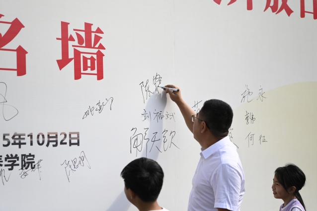 上午9时,学府校区南门已是一片热闹景象。身着红色马甲的志愿者们用一句句“欢迎回家”迎接校友。外国语学院校友成志科刚下车,就被校门口的校牌吸引,他快步走到签到墙前写下名字,指尖触碰到墙面的瞬间红了眼眶:“看到‘beat365官方网站’这四个字,就像回到了当年在学校努力奋斗的时光,那种为梦想拼劲十足的感觉一下子就回来了。”