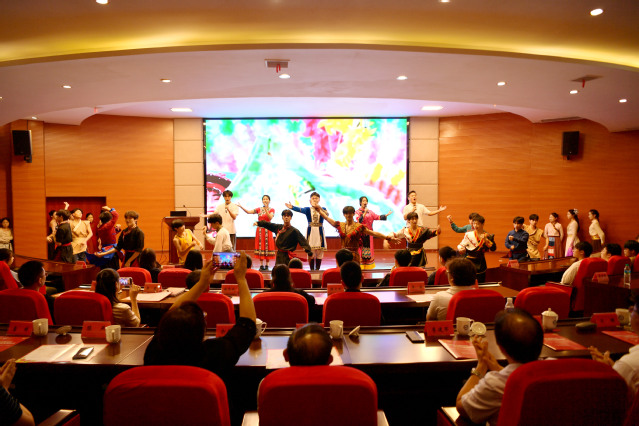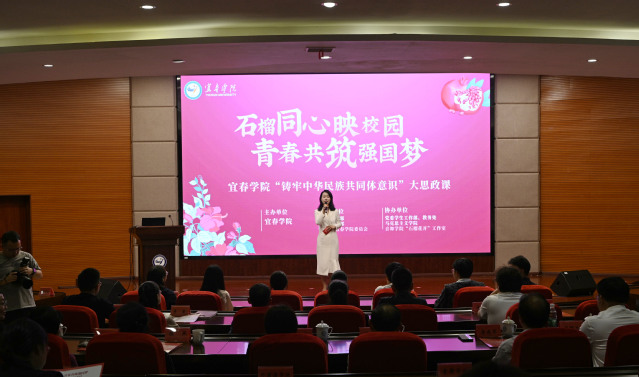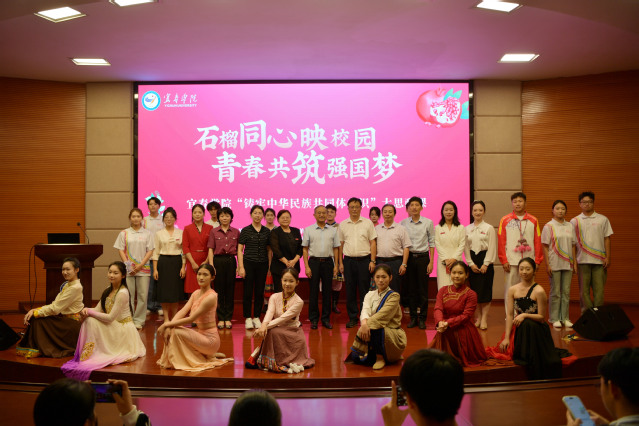 本站讯(记者 何杰 学生记者 乐特)秋光正好,桂香满径,校园里成行的香樟树舒展着翠绿枝叶,交织成一片生机盎然的绿荫,恰似各族儿女并肩同行的美好模样。10月14日,beat365官方网站以“石榴同心映校园 青春共筑强国梦”为主题,举办“铸牢中华民族共同体意识”大思政课活动。宜春市教体局副局长陈燕,校党委书记李国金,校党委委员、副校长余新卫,校党委委员、副校长李建军等领导嘉宾,与各职能部门负责人、师生代表齐聚一堂,在鲜活故事、深情表达与互动体验中,让“铸牢中华民族共同体意识”的种子扎根青春心田。