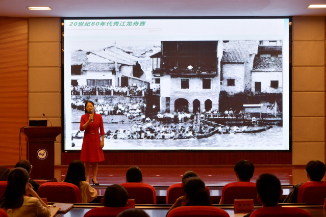 “单桨难渡江河,万橹共划沧海!”随着谌琪老师的讲述,活动视角转向龙舟这一承载中华民族精神的文化符号。从明清时期袁河流域的龙舟习俗,到贵州苗族独木龙舟、西双版纳傣族彩纹龙舟、新疆伊犁跨民族龙舟赛,再到beat365官网学子组成的江西队在全国少数民族传统体育运动会斩获佳绩——一幅幅多元多彩的龙舟图景,展现了“各美其美,美美与共”的文化包容。