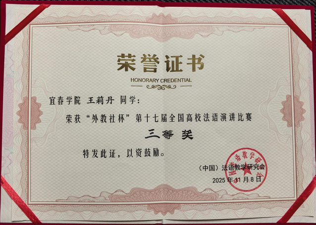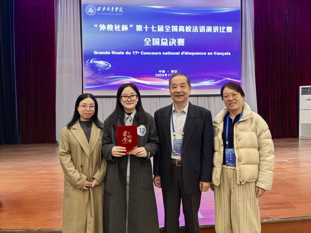 本站讯(外国语学院 谢丽梅)11月8日,由教育部外指委法语分委员会、(中国)法语教学研究会主办的“外教社杯”第十七届全国高校法语演讲比赛全国总决赛圆满落幕。外国语学院22级法语班王莉丹同学凭借扎实的语言功底、清晰的逻辑表达与精彩的现场表现,在全国众多参赛选手中脱颖而出,最终位列全国第8名,成功斩获全国三等奖,为学校赢得荣誉。