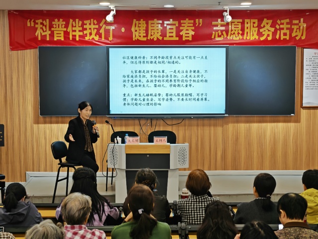 河北医科大学吴文娟教授专注营养学、公共卫生领域,围绕“日常习惯与健康”主题,走进江西百神药业股份有限公司与宜春市宜阳新区官园街道景升社区。她从“衣食住行”细节入手,为企业职工讲解冬季分层保暖、饮食粗细搭配技巧;针对社区居民,重点解答儿童养育常见问题,还为老年人科普体态健康与高血压饮食预防知识,贴心实用的内容深受家长与老年群体认可。