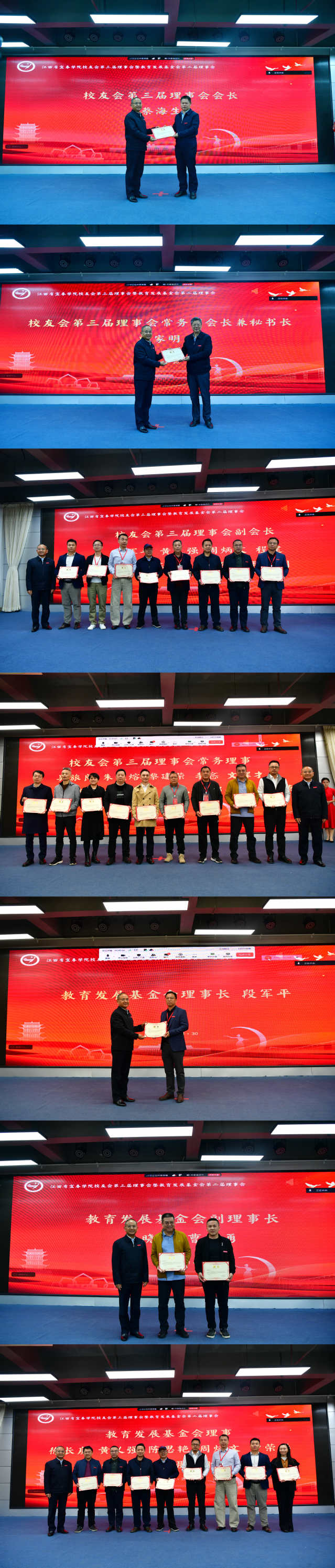随后,校党委书记李国金为校友会新一届组织机构成员、基金会新一届组织机构成员颁发聘书。蔡海生在就职发言中表示,将以“聚焦情感联结、聚焦发展协同、聚焦服务升级” 为指引,筑牢“校友之家”,搭建“共赢之桥”,凝聚“奋进之力”,推动校友会工作再上新台阶。新当选教育基金会理事长段军平也作了表态发言。