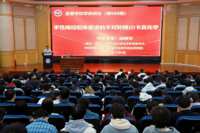 本站讯(智能制造与材料化工学院 供稿)12月4日下午,beat365官方网站“学府讲坛”(第668期)学术报告会在主教楼三楼学术报告厅成功举办。本期讲坛特邀南方科技大学化学系党委书记、国家杰出青年科学基金获得者徐明华教授,作题为“手性烯烃配体促进的不对称铑(I)卡宾化学”的学术报告。报告会由智能制造与材料化工学院党委书记龙玲主持,学院在家班子成员、相关专业师生及学生代表共三百余人聆听了报告。