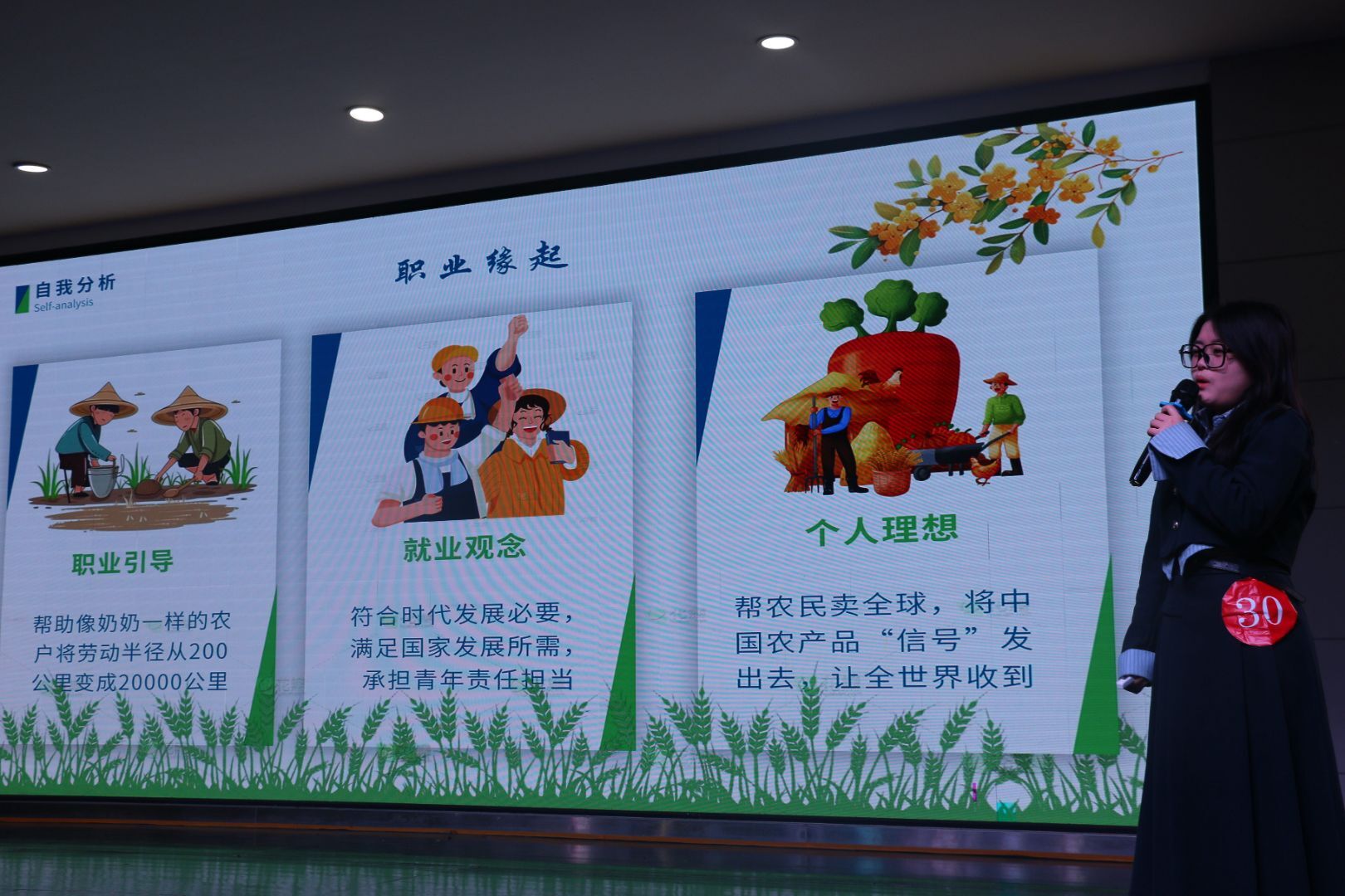 成长赛道复赛重点考察选手职业目标的合理性、学习实践行动的成效与成长路径的动态优化能力。选手结合生涯发展报告进行7分钟主题陈述,并接受5分钟评委提问。评审围绕职业目标(30分)、学习实践行动(50分)、优化改进(20分)三个维度展开。